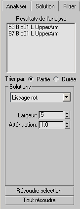 - Détermine la méthode utilisée pour tenter de corriger les erreurs trouvées par l'analyseur. En règle générale vous devez essayer d'utiliser une solution compatible avec la propriété sélectionnée pour l'analyseur. Par exemple, si vous avez sélectionné un détecteur de bruit avec la propriété Vitesse rot., choisissez alors également un analyseur avec une propriété de rotation. La seule exception à cette règle est lorsque vous préférez supprimer les clés plutôt que de les modifier. Dans ce cas, choisissez l'outil de correction Supprimer les clés.