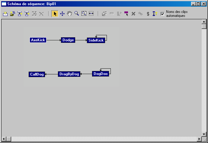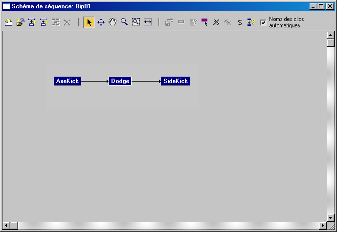 L’utilisation de transitions optimisées peut notamment vous faire gagner un temps considérable lors de la création de simulations de foules dans la mesure où ces dernières peuvent utiliser plusieurs dizaines de clips. Pour animer un ou plusieurs bipèdes en mode Séquence, des transitions seront nécessaires entre les clips dans le Schéma de séquence.