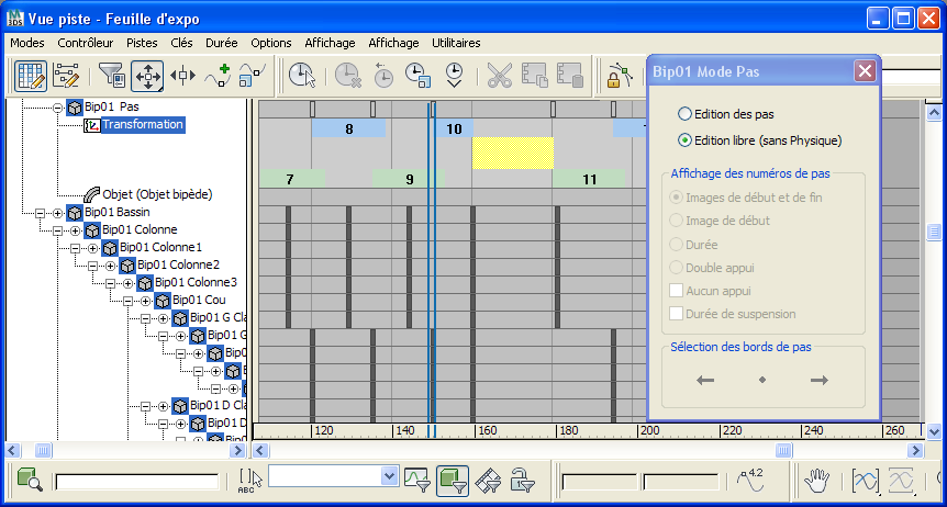 Par exemple, si vous voulez faire courir le bipède, le faire plonger dans une piscine, puis grimper hors de celle-ci, vous créerez des pas pour les parties de l'animation où il court et grimpe, mais pas pour la partie où il nage. Lorsque vous activerez les pas, le bipède sera en suspension pendant la période où il saute et nage, entre les pas correspondant aux périodes de course et d'ascension.