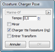 Lors du chargement d'une pose ou d'un fichier d'animation, tous les paramètres de chargement sont "actifs". Vous pouvez modifier le fichier chargé, le temps de chargement, ou n'importe quel paramètre en rapport avec le chargement de la pose. En tant que concepteur, vous pouvez valider la pose chargée en déplaçant la glissière temps et en affichant les résultats du chargement de pose ou des données d'animation avant d'appliquer le résultat en cliquant sur OK.
