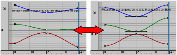 Si vous convertissez une courbe de rotation Quaternion en une courbe Euler, les clés de tangentes obtenues sont définies sur Lissage. Si, au contraire, vous transformez une courbe de rotation Euler en une courbe de rotation Quaternion, l'interpolation Bézier des tangentes est maintenue autant que possible. Toutefois, si cette interpolation est trop extrême et ne peut pas être émulée par les valeurs TCA, elle est réduite au-dessous des limites quaternioniques.