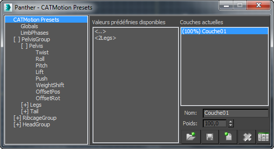 Avertissement : Vous pouvez modifier les valeurs dans une couche CATMotion uniquement lorsque la valeur Poids de la couche est supérieure à 50,0% (c.-à-d. 50,001% et plus). Toutefois, pour obtenir des résultats plus prévisibles, définissez toujours le poids de la couche à 100% lorsque vous modifiez ses composants.
