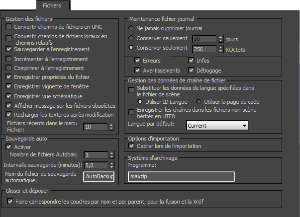 Le groupe de fonctions Fichiers de la boîte de dialogue Préférences vous permet de définir les options relatives au traitement des fichiers. Vous pouvez choisir le programme utilisé pour l'archivage et contrôler les options de maintenance du fichier-journal. De plus, la fonction de sauvegarde automatique vous permet d'enregistrer automatiquement votre travail à intervalles réguliers.