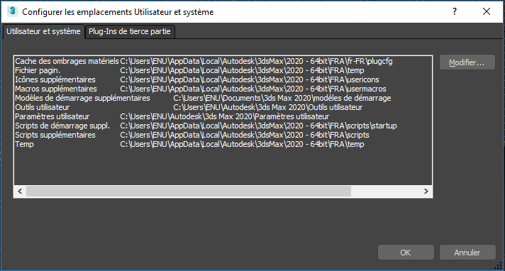 Toutes les modifications apportées aux chemins sont enregistrées dans le fichier 3dsmax.ini.