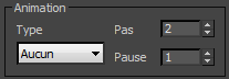 - FonduLes menus Quadr. apparaissent en fondu (de transparent à opaque) dans le sens trigonométrique, de Quadr. 1 (en bas à droite) à Quadr. 4 (en bas à gauche). La vitesse de fondu est définie par la valeur Pas, tandis que la durée entre les quadrilatères est définie par la valeur Pause.