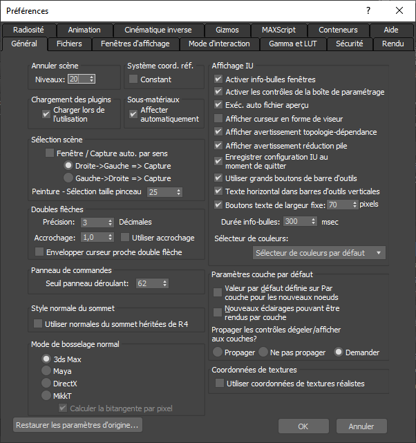 3ds Max propose de nombreuses options agissant sur son affichage et son fonctionnement. Ces options sont disponibles dans une série de groupes de fonctions à onglets, accessibles par le biais de la boîte de dialogue Préférences.