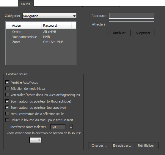 Important : Les paramètres de la souris qui ont une incidence sur les fonctions de zoom et de panoramique en mode 3ds Max et non pas en mode Maya (trois paramètres de raccourci et direction du zoom avant) influent également sur les fenêtres de la vue piste, le mixeur de mouvements, le mode Séquence, la boîte de dialogue Editer UVW et la barre de piste développée ("mini-éditeur de courbes").