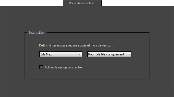 Dans le groupe de fonctions Mode d'interaction de la boîte de dialogue Préférences, vous pouvez indiquer si le comportement des raccourcis clavier et de la souris correspond aux versions antérieures de 3ds Max ou d'Autodesk Maya.