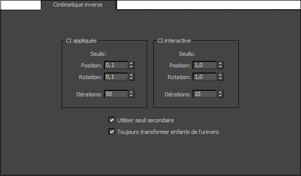 Les paramètres Seuil et Itérations traduisent un compromis entre précision et vitesse. Les deux zones de paramètres vous permettent d'ajuster individuellement le comportement de la CI interactive et de la CI appliquée. La CI interactive offre une réponse rapide et en temps réel. Si vous recherchez la vitesse, il est donc préférable de paramétrer la CI interactive. La CI appliquée offre la solution CI qui se rapproche le plus des objets de contrôle. Lorsque vous recherchez la précision, la CI appliquée est mieux adaptée.