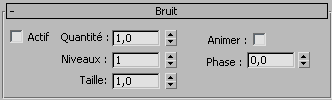 Les commandes suivantes, qui s'affichent dans le panneau déroulant Bruit, permettent de paramétrer plusieurs maps 2D :