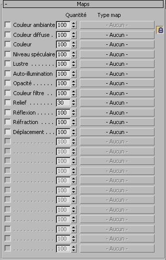 Ce panneau déroulant vous permettent d'affecter une map ou un ombrage à de nombreux paramètres de matériau standard. Vous pouvez également attribuer des textures et des ombrages sur le panneau déroulant sur lequel le paramètre apparaît en premier lieu : la fonction principale de ce panneau déroulant est qu'il vous permet également d'activer ou de désactiver un ombrage de paramètre à l'aide de la case à cocher, sans supprimer la texture.