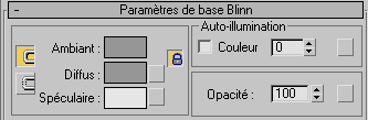 Lorsque vous attribuez une map à un composant scalaire (tel que Niveau spéculaire, Lustre, Auto-illumination et Opacité), la valeur du composant indiquée dans le panneau déroulant Paramètres de base est fusionnée avec la valeur Quantité de la map associée dans le panneau déroulant Maps.