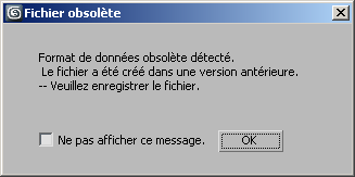 Lors de l'ouverture d'une scène créée dans une version antérieure de 3ds Max, une boîte de dialogue Fichier obsolète s'affiche.