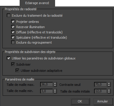 Pour plus d'informations sur la zone Propriétés de radiosité, reportez-vous à la rubrique Contrôles de radiosité.