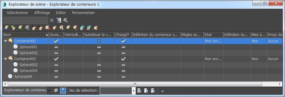 L'explorateur de conteneurs est une boîte de dialogue non modale qui permet d'afficher, de trier et de sélectionner des conteneurs et leur contenu. Il offre toutes les fonctionnalités de l'explorateur de scènes, ainsi que des commandes spécifiques aux conteneurs, dans la barre d'outils Conteneur.