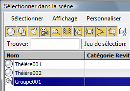 Un nom de groupe est similaire à un nom d'objet, à une différence près: il est associé à un objet groupe. Dans les listes comme celle du flotteur de sélection, les noms de groupe apparaissent entre crochets. Par exemple : [Groupe01]. Dans l'explorateur de scènes et les boîtes de dialogue associées, les crochets entourent l'icône de l'objet groupe.