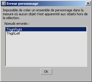 Un ou tous les membres d'un assemblage de personnage peuvent être liés à un objet unique en dehors de l'assemblage, mais non à plusieurs objets. Par exemple, les objets ThighLeft et ThighRight, qui font tous deux partie de l'assemblage, peuvent être liés à l'objet Pelvis, qui ne fait pas partie de l'assemblage. Toutefois, si les objets ThighLeft et ThighRight sont associés à des objets différents externes à l'assemblage, la création de l'assemblage échoue, et le message d'erreur suivant apparaît :