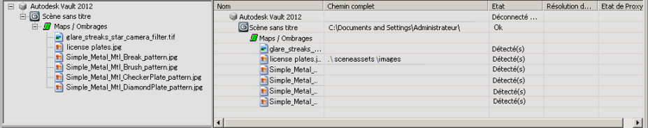 Cette fenêtre affiche également pour chaque archive des icônes indiquant le type de l'archive (fichier de scène 3ds Max, branche de map, etc.) et son état, le cas échéant. La plupart des icônes d'état sont décrites dans la rubrique Aide de l'Explorateur de coffre-fort