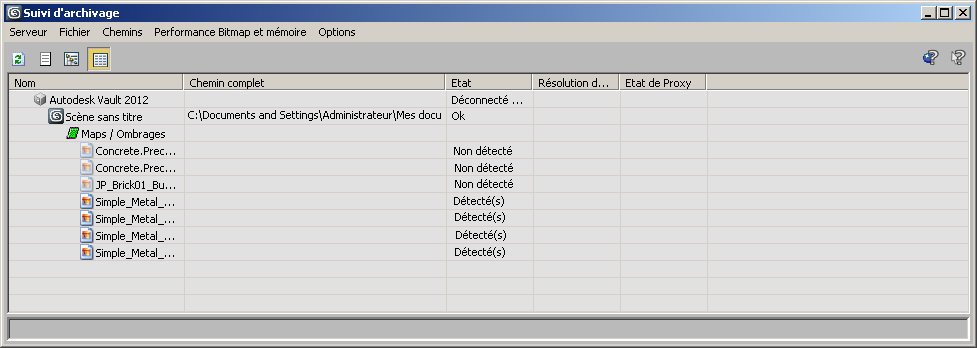 ActualiserRecharge la liste d'archives à partir de la scène locale et met à jour le contenu de la fenêtre. Cette option permet d'ajouter des références externes, car celles-ci ne sont pas automatiquement détectées et mises à jour dans ce tableau.