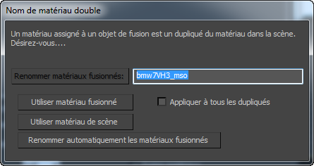 La boîte de dialogue Doublon s'affiche si, lorsque vous avez cliqué sur OK dans la boîte de dialogue Fusion, un ou plusieurs matériaux à fusionner ont le même nom que des matériaux dans la scène ouverte.