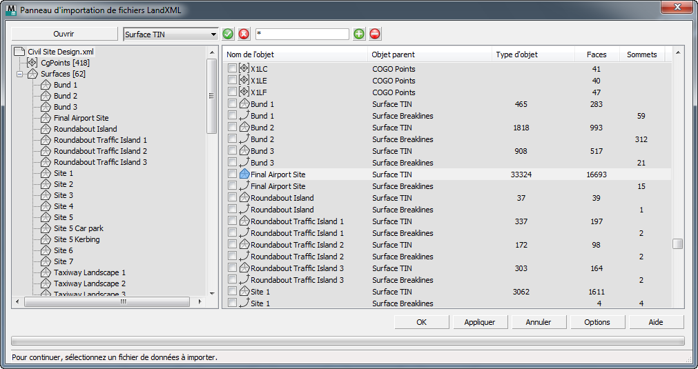 LandXML est une norme de données non propriétaire établie par un consortium de partenaires industriels. Elle est prise en charge par une large gamme d'applications de conception d'ingénierie civile telles que InRoads, Geopak, Civil3D et MicroStation. Pour plus d'informations sur LandXML, visitez le site www.landxml.org.