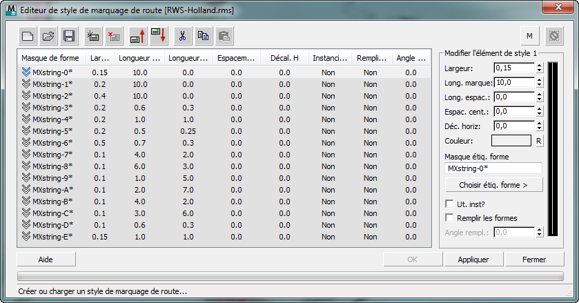 L'Editeur de styles de marquages au sol permet d'appliquer une large gamme de types de marquages au sol à un modèle de visualisation en associant un type de marquage au sol à une série de masques d'étiquette de forme.