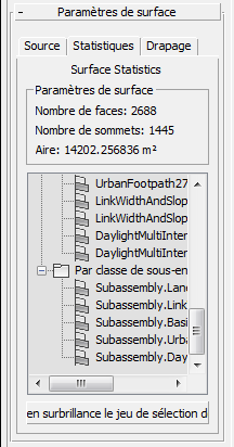 Pour les surfaces de projet 3D AutoCAD Civil 3D importées, un grand nombre de jeux de sélection de triangle/face renvoyant directement à la structure de projet 3D source s'affichent. Cela permet d'identifier des faces individuelles par nom de sous-ensemble, classe de sous-ensemble et code de lien d'origine.