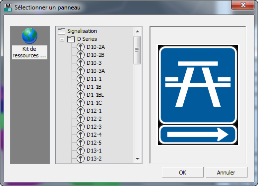 - Cliquez sur ce bouton pour afficher la boîte de dialogue Sélectionner un panneau vous permettant de choisir une définition d'objet panneau dans un kit de ressources Civil View actif.