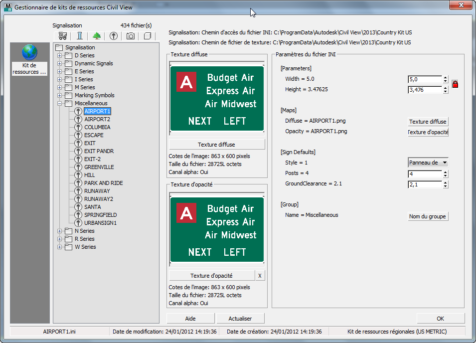 Les kits de ressource Civil View contiennent de nombreuses ressources utilisées pour générer du géométrique et de matériau dans les scènes Civil View. Généralement, les kits de ressources incluent des bitmaps, des styles, des fichiers de paramètres et des bibliothèques d'objets.