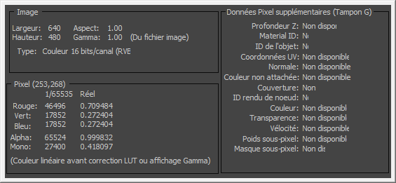 Si la sortie de rendu utilise un format contenant des canaux supplémentaires, comme RPF ou RLA, la boîte de dialogue contextuelle d'informations présente ces données dans la zone Données de pixel supplémentaires. Celle-ci indique tous les canaux disponibles. Si un canal n'est pas présent, sa valeur indique " N/A " (non disponible).