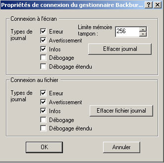 La boîte de dialogue Propriétés de journalisation vous permet de spécifier les types de messages s'affichant dans la fenêtre du Gestionnaire ou du Serveur et ceux envoyés vers un fichier-journal. Chaque type de message journal est expliqué ci-dessous.