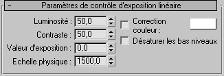 Contrôle d'exposition linéaire échantillonne le rendu et utilise la luminosité moyenne de la scène pour associer des valeurs physiques à des valeurs RVB. Ce type de contrôle d'exposition est particulièrement adapté aux scènes dotées d'une plage dynamique relativement faible.