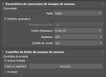 Panneau déroulant Paramètres de conversion de masque de mousse