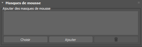 - Cliquez sur Choisir pour sélectionner dans la scène des objets à ajouter en tant que masques de mousse, ou cliquez sur Ajouter pour sélectionner un masque de mousse dans une boîte de dialogue. Cliquez sur Supprimer pour supprimer un masque de mousse sélectionné.