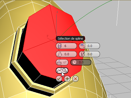 3ds Max aligne la spline sur les normales des faces d'origine, ce qui rend les cornes plus perpendiculaires au reste du casque. L'effet obtenu est plus ou moins satisfaisant selon la spline tracée.