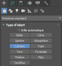 (Géométrie). Assurez-vous que l'option Primitives standard est sélectionnée dans la liste déroulante, puis cliquez sur Cylindre dans le panneau déroulant Type d'objet.