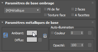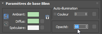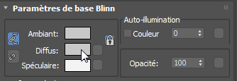 “Blinn”, nom donné par l'infographiste James Blinn, est le type d'ombrage par défaut utilisé par le matériau Standard. Un ombrage détermine l'interaction du matériau avec la lumière. Et "Diffuse" fait référence à la couleur du matériau de base. Pour obtenir plus d'informations sur les ombrages et les matériaux en général, reportez-vous à l'aide de 3ds Max.