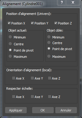 - Dans la boîte de dialogue Alignement (Cylindre01)