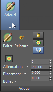 Lorsque l'option Sélection adoucie est activée, 3ds Max affiche les commandes de sélection adoucie dans un groupe de fonctions temporaire nommé "Adouci" à droite des commandes existantes du ruban. S'il n'y a pas suffisamment d'espace sur le ruban pour afficher toutes les commandes, seul le titre du groupe de fonctions s'affiche. Vous devez alors cliquer sur le groupe de fonctions pour afficher ses commandes.