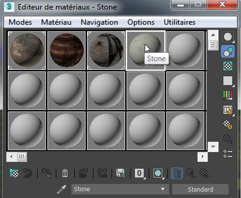Si vous ne pouvez pas voir le champ échantillon du matériau Pierre, cliquez avec le bouton droit de la souris sur l'un des champs échantillons et sélectionnez Fenêtres échantillon 5 X 3 pour afficher plusieurs champs.