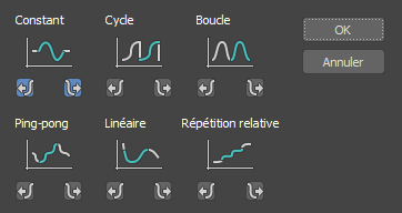 Cette boîte de dialogue présente diverses options permettant de poursuivre une partie de l'animation en dehors de l'intervalle de clés que vous venez de créer. Chaque option est représentée par un bouton graphique. Dans le graphique, l'animation d'origine est représentée par une trace solide et l'effet de la poursuite de l'animation, par des traces en pointillé.