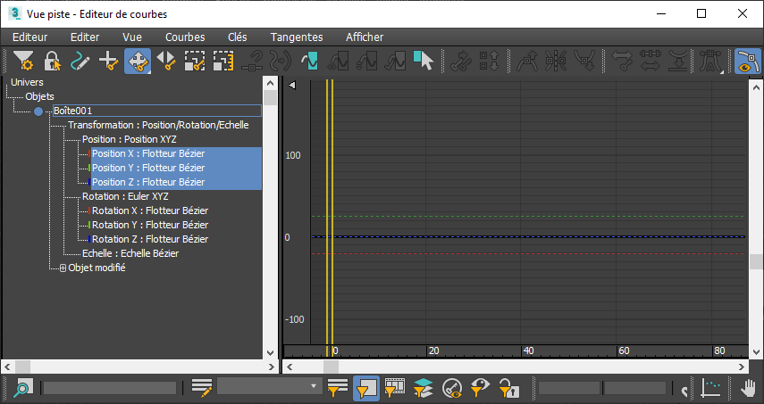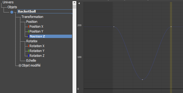 fenêtre Contrôleur (liste des objets et des pistes située sur la gauche) de l'éditeur de courbes, cliquez sur la piste Position Z pour afficher la courbe de cette piste.