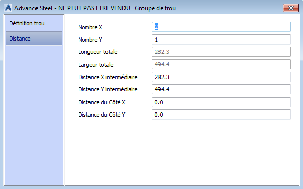 Dans cet onglet de la boîte de dialogue des propriétés, vous pouvez modifier la taille du groupe de trous, la distance entre les trous et le nombre de trous.