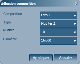 - Passez à l'onglet Composition, puis créez une composition d'ancrage, cliquez sur le bouton Nouveau en regard de la liste déroulante du champ Nom de la composition de boulon, entrez un nom explicite (par exemple, 2Na2W, qui correspond à un ensemble de boulons avec 2 écrous (N) et 2 rondelles (2W) et cliquez sur Appliquer.