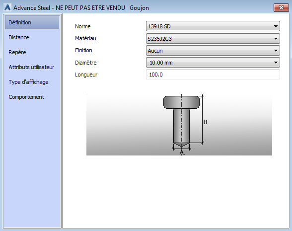 | Diamètre | Permet de sélectionner le diamètre de goujon dans la liste. |