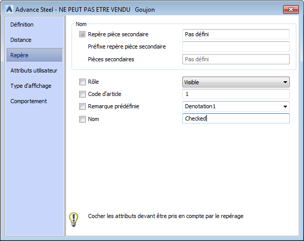 | Rôle | Attribue le rôle dans le modèle. Il est par exemple pris en compte lors de la création de dessin afin d'attribuer une présentation, une cotation et un style de label. |
