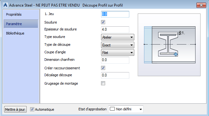 Boîte de dialogue Découpe Profil sur Profil : onglet Paramètres
