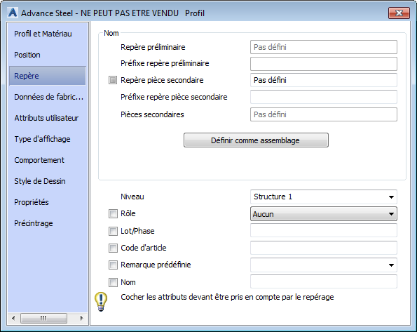 | Repère d'assemblage | Définit le repère d'assemblage attribué à l'élément. |