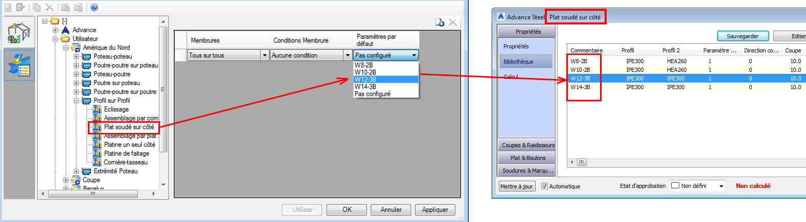 Par exemple : si une règle d'assemblage est créée pour Poutre-Poutre, poutre I sur I, Ame du membre principal afin de créer un plat soudé sur côté, les paramètres par défaut peuvent alors accepter une règle indiquant également : Poutre-Poutre, assemblage Plat soudé sur côté, poutre I sur I, Ame, incliné en biais. En outre, une deuxième règle peut être ajoutée pour Ame-Perpendiculaire, correspondant à la même règle d'assemblage mentionnée ci-dessus : pour une règle d'assemblage qui permet la création d'un plat soudé sur côté lorsque deux poutres sont assemblées, deux lignes de paramètres par défaut peuvent être configurées pour utiliser différents paramètres de bibliothèque pour les situations perpendiculaires, et inclinées et en biais.