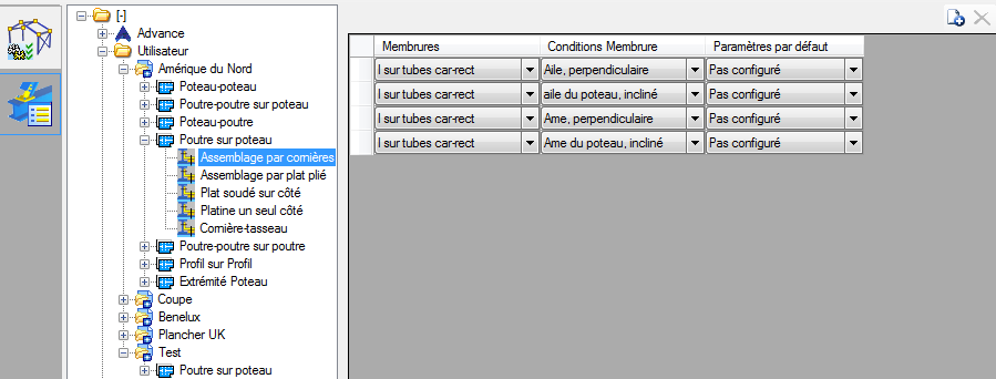 Pour les nouveaux profils, la liste associée à la combinaison noeud - assemblage sera vide. Toutes les règles doivent être ajoutées manuellement. Elles ne doivent pas nécessairement correspondre à la configuration Règle de connexion, mais il est important que la combinaison respective de contraintes géométriques, de types de membre, d'assemblages et de noeuds corresponde à l'une des configurations Règle de connexion.